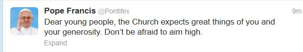 «Αγαπημένοι νέοι. Η Εκκλησία περιμένει σπουδαία πράγματα από εσάς. Μην φοβάστε να στοχεύετε ψηλά», είναι το αισιόδοξο μήνυμα που μοιράστηκε ο Πάπας Φραγκίσκος μέσω Twitter, απευθυνόμενος στη νέα γενιά.