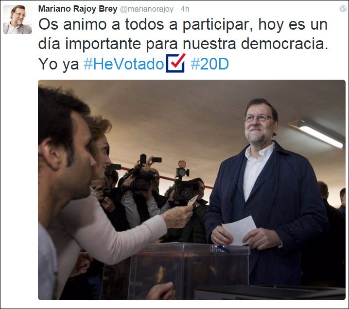 Ιδιαίτερα κρίσιμη είναι η σημερινή εκλογική διαδικασία στην Ισπανία, με την αυτοδυναμία να θεωρείται ακατόρθωτη. Ο Μαριάνο Ραχόι προέτρεψε, μέσω Twitter, όλους τους Ισπανούς να μεταβούν στις κάλπες, ανεβάζοντας μία φωτογραφία την ώρα που ψήφισε ο ίδιος.