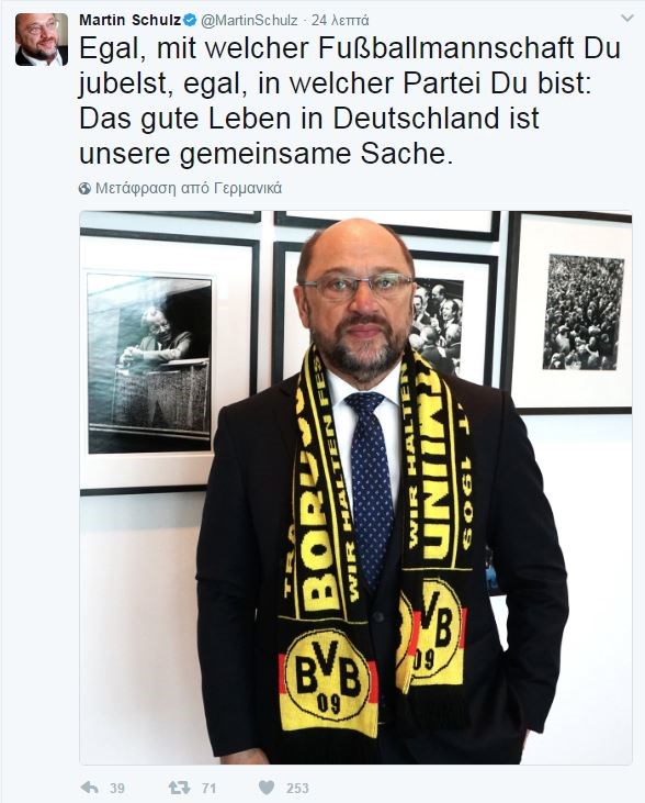 Μήνυμα για τη χθεσινή επίθεση στο πούλμαν της Ντόρτμουντ έστειλε μέσω του προσωπικού του λογαριασμού στο Twitter ο υποψήφιος των σοσιαλδημοκρατών για την προεδρία της Γερμανίας, Μάρτιν Σουλτς.Ο πρώην πρόεδρος του Ευρωκοινοβουλίου φωτογραφήθηκε με κασκόλ της γερμανικής ομάδας και στο μήνυμα του ανέφερε: «Δεν έχει σημασία ποια ομάδα υποστηρίζεις, τι κόμμα είσαι. Η καλή ζωή στη Γερμανία είναι υπόθεση όλων μας».Δείτε την ανάρτηση του Μάρτιν Σουλτς: