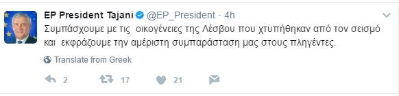 Με ανάρτησή του στο Twitter, και μάλιστα στα ελληνικά, ο κ. Ταγιάνι δήλωσε: «Συμπάσχουμε με τις οικογένειες της Λέσβου που χτυπήθηκαν από τον σεισμό και εκφράζουμε την αμέριστη συμπαράσταση μας στους πληγέντες».