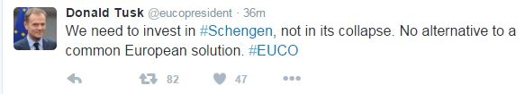 Μήνυμα προς τις χώρες της Ευρώπης για τη συνθήκη Σένγκεν έστειλε ο πρόεδρος του Ευρωπαϊκού Συμβουλίου, Ντόναλντ Τουσκ μέσω του λογαριασμού του στο twitter.