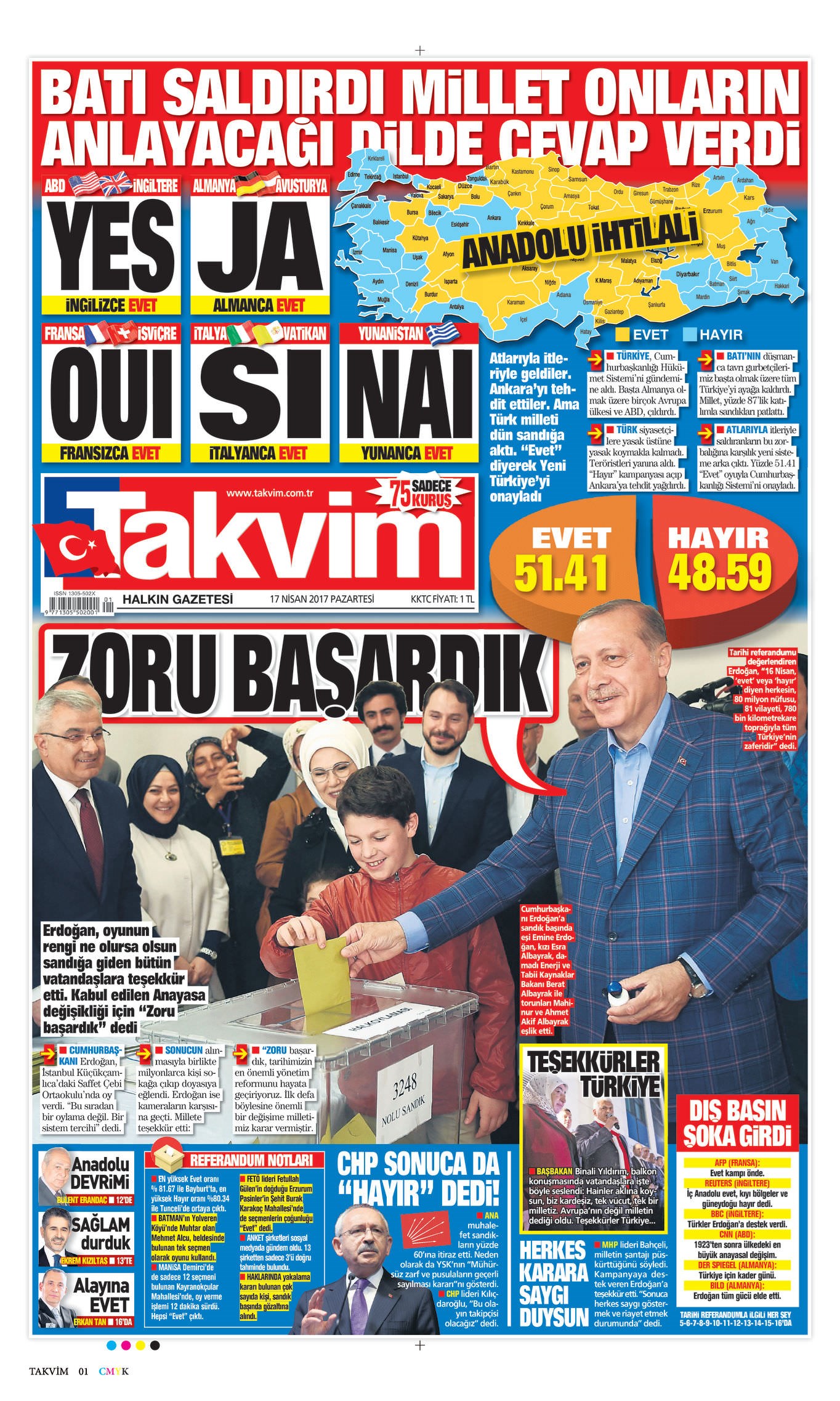Η φιλοκυβερνητική εφημερίδα «Takvim» που κυκλοφορεί με τίτλο «Η Δύση επιτέθηκε, αλλά ο τουρκικός λαός απάντησε με τη γλώσσα που καταλαβαίνουν» φιλοξενεί στο πρωτοσέλιδό της, το «ναι» που είπε ο τουρκικός λαός στο δημοψήφισμα σε 5 γλώσσες, ανάμεσα στις οποίες είναι και τα ελληνικά.Δείτε το πρωτοσέλιδο: