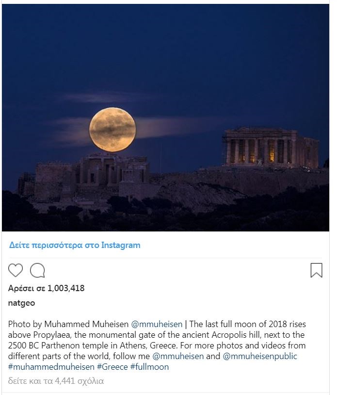 Την τελευταία πανσέληνο του 2018, δίπλα στον Παρθενώνα, διάλεξε να ποστάρει το National Geographic, αποχαιρετώντας το χρόνο.Η εντυπωσιακή φωτογραφία ανήκει στον βραβευμένο με Πούλιτζερ Ισραηλινό φωτογράφο, Muhammed Muheisen. Το καρέ ποσταρίστηκε σήμερα από το National Geographic, ωστόσο, τραβήχτηκε στις 22 Δεκεμβρίου.Δείτε την υπέροχη φωτογραφία: