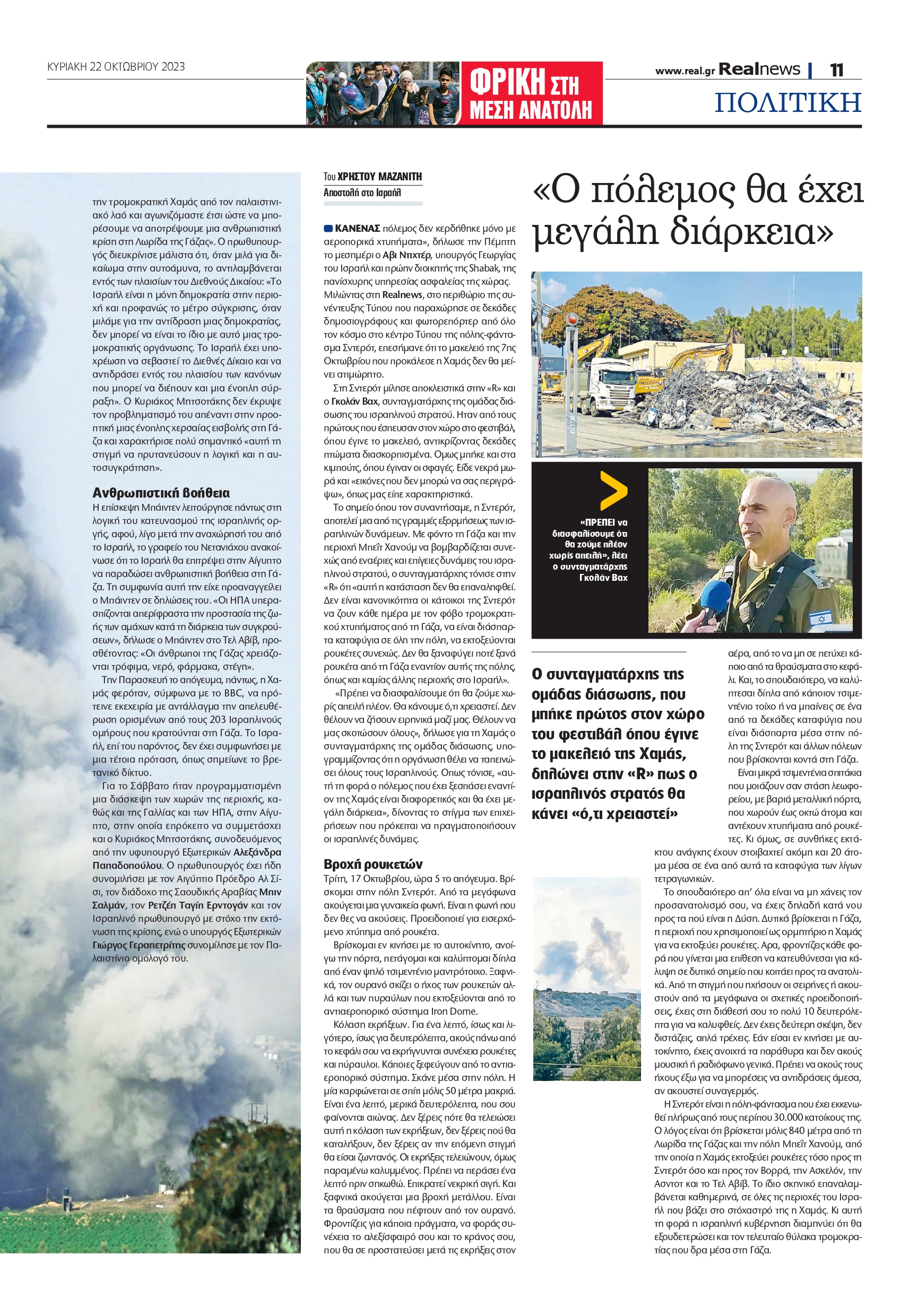Στη Σντερότ μίλησε αποκλειστικά στην «R» και ο Γκολάν Βαχ, συνταγματάρχης της ομάδας διάσωσης του ισραηλινού στρατού. Ήταν από τους πρώτους που έσπευσαν στον χώρο στο φεστιβάλ, όπου έγινε το μακελειό, αντικρίζοντας δεκάδες πτώματα διασκορπισμένα. Όμως μπήκε και στα κιμπούτς, όπου έγιναν οι σφαγές. Είδε νεκρά μωρά και «εικόνες που δεν μπορώ να σας περιγράψω», όπως μας είπε χαρακτηριστικά. Το σημείο όπου τον συναντήσαμε, η Σντερότ, αποτελεί μια από τις γραμμές εξορμήσεως των ισραηλινών δυνάμεων. Με φόντο τη Γάζα και την περιοχή Μπεΐτ Χανούμ να βομβαρδίζεται συνεχώς από εναέριες και επίγειες δυνάμεις του ισραηλινού στρατού, ο συνταγματάρχης τόνισε στην «R» ότι «αυτή η κατάσταση δεν θα επαναληφθεί. Δεν είναι κανονικότητα οι κάτοικοι της Σντερότ να ζουν κάθε ημέρα με τον φόβο τρομοκρατικού χτυπήματος από τη Γάζα, να είναι διάσπαρτα καταφύγια σε όλη την πόλη, να εκτοξεύονται ρουκέτες συνεχώς. Δεν θα ξαναφύγει ποτέ ξανά ρουκέτα από τη Γάζα εναντίον αυτής της πόλης, όπως και καμίας άλλης περιοχής στο Ισραήλ».