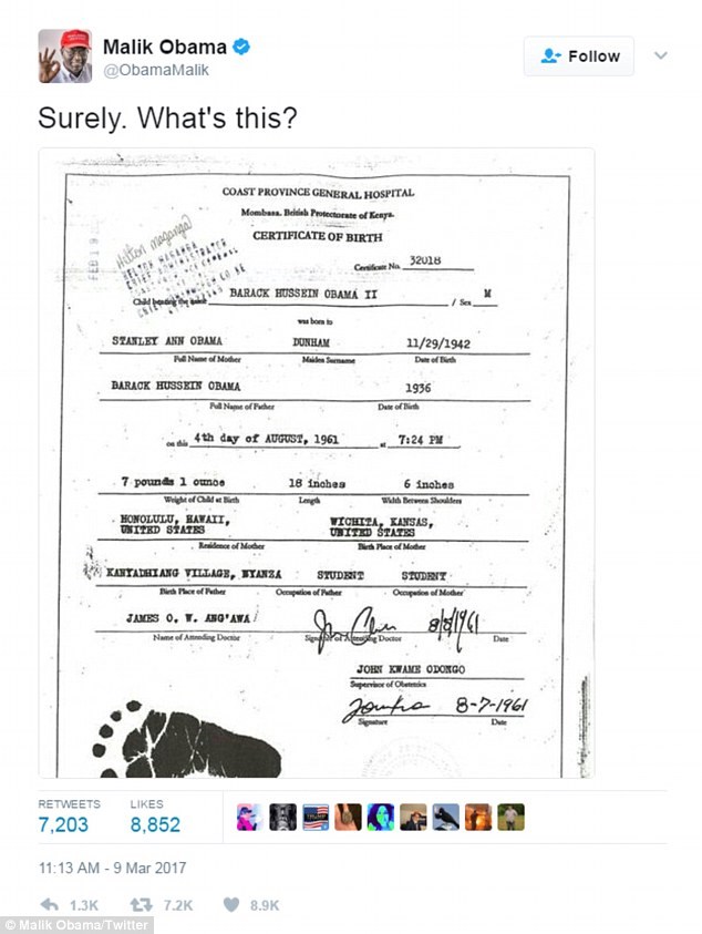 Την στήριξή του στο πρόσωπο του Ντόναλντ Τραμπ έχει εκφράσει πολλές φορές, ο ετεροθαλής αδελφός του πρώην Αμερικανού Προέδρου, Μπαράκ Ομπάμα, Μαλίκ.Ο Μαλίκ Ομπάμα, μάλιστα επανέφερε στο προσκήνιο το ερώτημα για την καταγωγή του πρώην Προέδρου των ΗΠΑ. Ανέβασε στα social media αντίγραφο πλαστού πιστοποιητικού γεννήσεώς του, ισχυριζόμενος πως γεννήθηκε στη Μομπάσα, στην Κένυα.Το πιστοποιητικό γέννησης φέρει το λογότυπο του νοσοκομείου “Coast Province General Hospital” στη Μομπάσα. Το 2009, το έγγραφο πωλούνταν στο eBay από τον χρήστη με το όνομα Lucas Smith. Το σάιτ όμως κατέβασε τη σελίδα του συγκεκριμένου χρήστη.