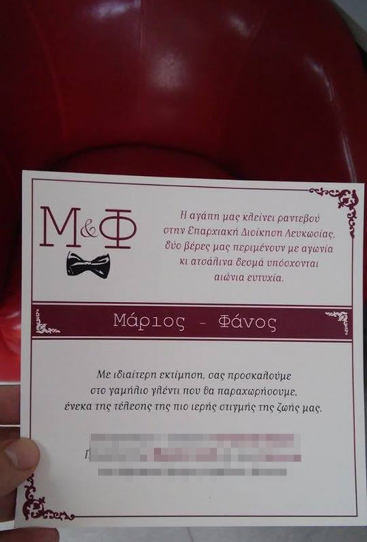 «Η αγάπη μας κλείνει ραντεβού στην Επαρχιακή Διοίκηση Λευκωσίας, δύο βέρες μας περιμένουν με αγωνία κι ατσάλινα δεσμά υπόσχονται αιώνια ευτυχία».