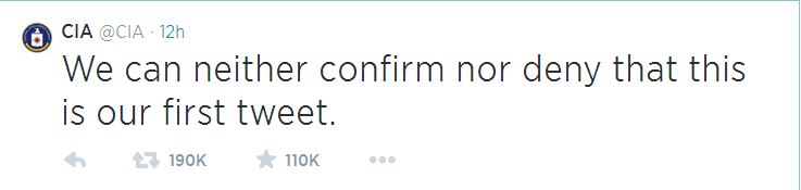 Ειδικότερα το πρώτο tweet της CIA που έγινε την Παρασκευή λέει απλά: Δε μπορούμε ούτε να επιβεβαιώσουμε ούτε να αρνηθούμε ότι αυτό είναι το πρώτο μας tweet.