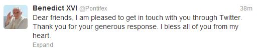 “Αγαπητοί φίλοι, είμαι ευχαριστημένος που έχω επαφή με σας μέσω twitter. Σας ευχαριστώ για την γενναιόδωρη ανταπόκριση. Σας ευλογώ όλους μέσα από την καρδιά μου”.