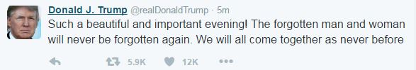 Την πρώτη του ανάρτηση στον λογαριασμό του στο twitter έκανε μετά την εκλογή του ο νέος πρόεδρος των ΗΠΑ Ντόναλντ Τραμπ.