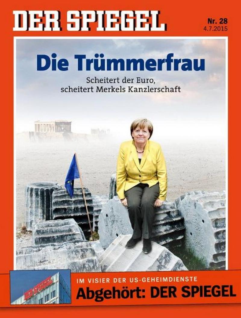 Το γερμανικό περιοδικό Der Spiegel, μια ημέρα πριν από το κρίσιμο δημοψήφισμα στην Ελλάδα κυκλοφορεί με πρωτοσέλιδο την Άνγκελα Μέρκελ και τίτλο η “κυρία των ερειπίων”.