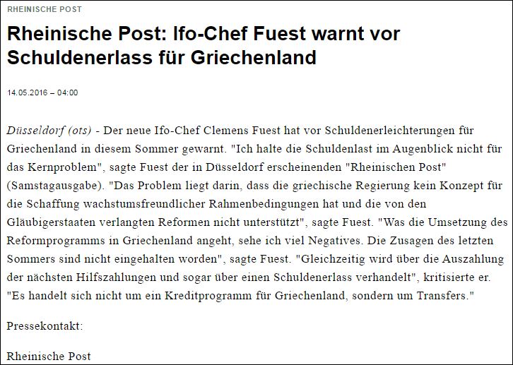 Όχι το χρέος, αλλά η έλλειψη σχεδίου ανάπτυξης και στήριξης των μεταρρυθμίσεων, εκτιμά ότι είναι το κεντρικό πρόβλημα της Ελλάδας, ο Κλέμενς Φούεστ, διάδοχος του Χανς-Βέρνερ Ζιν στην ηγεσία του Ινστιτούτου Οικονομικών Ερευνών Ifo του Μονάχου και μέλος της Επιτροπής «Σοφών» της γερμανικής οικονομίας.