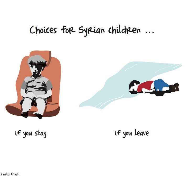 “Αυτές είναι οι επιλογές για τα παιδιά από τη Συρία”, γράφει ο σκιτσογράφος, θέλοντας να στείλει ένα ηχηρό μήνυμα σε όσους ευθύνονται για τη φρίκη του πολέμου, αλλά και όσους δεν κινητοποιούνται, προκειμένου να μπει ένα τέλος στους θανάτους αθώων ψυχών.