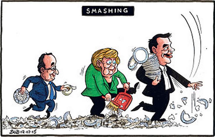 Με ένα σκίτσο, στο οποίο ο Έλληνας Πρωθυπουργός, Αλέξης Τσίπρας παρουσιάζεται να σπάει πιάτα, η γερμανίδα Καγκελάριος Άνγκελα Μέρκελ να τον ακολουθεί και τα μαζεύει και ο Φρανσουά Ολάντ από πίσω να τα ξανακολλάει με μονωτική ταινία, η Βρετανική εφημερίδα Τelegraph, περιγράφει με χιουμοριστικό τρόπο τις εξελίξεις στο ελληνικό ζήτημα.