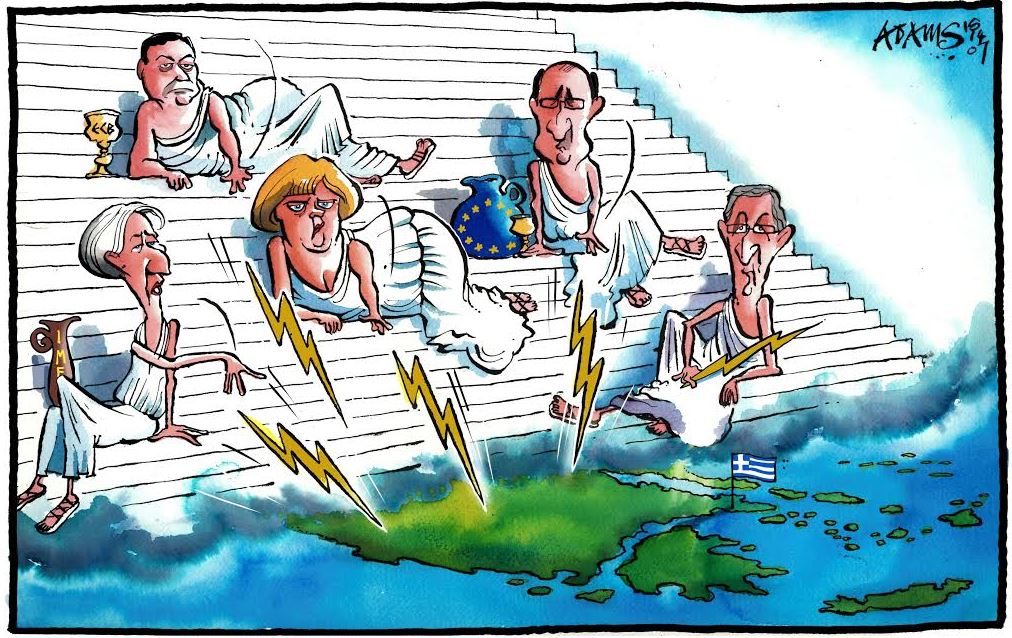 Σε σκίτσο, που ανάρτησε στον λογαριασμό της στο twitter, η βρετανική εφημερίδα Τelegraph, παρουσιάζει την Άνγκελα Μέρκελ, την Κριστίν Λαγκάρντ, τον Φρανσουά Ολάντ, τον Ζαν Κλόντ Γιουνκερ και τον Μάριο Ντράγκι, ντυμένους σαν θεούς του Ολύμπου, να κάθονται πάνω από την Ελλάδα και να ρίχνουν κεραυνούς προς τη χώρα.