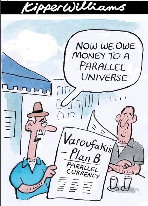 Πηγή έμπνευσης για τον σκιτσογράφο του Guardian, Kipper Williams αποτέλεσε ο Γιάνης Βαρουφάκης και τα δημοσιεύματα για το Plan B του πρώην υπουργού Οικονομικών και τo σχέδιo για παράλληλο νόμισμα.
