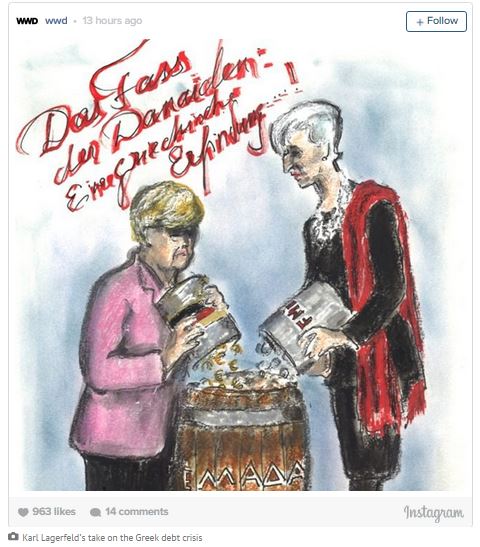 Ο γνωστός μόδιστρος Καρλ Λάγκερφελντ σχεδίασε ένα σκίτσο με την Γερμανίδα καγκελάριο Άνγκελα Μέρκελ και την γενική διευθύντρια του Διεθνούς Νομισματικού Ταμείου Κριστίν Λαγκάρντ.