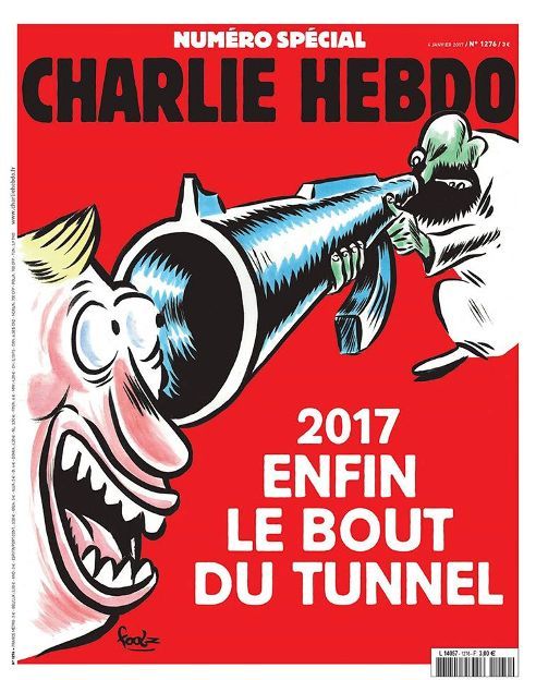 Στο εξώφυλλο ένας γελαστός άνδρας αναφωνεί «2017, επιτέλους το τέλος του τούνελ» κοιτώντας όμως μέσα στην κάννη του όπλου ενός γενειοφόρου τζιχαντιστή.