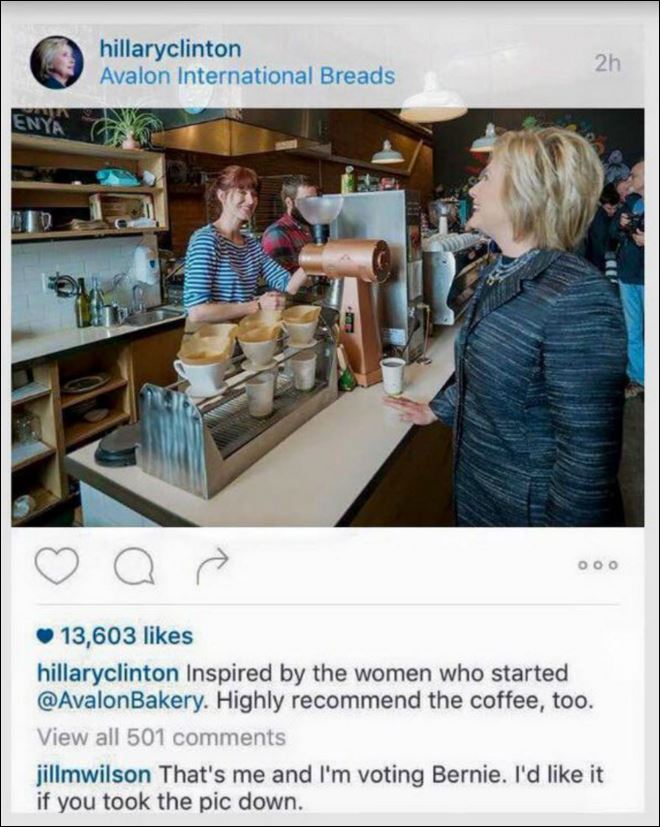 Συγκεκριμένα, μια κοπέλα σχολίασε: «Eγώ είμαι αυτή που ξεκίνησε την συγκεκριμένη επιχείρηση και επίσης ψηφίζω τον Μπέρνι Σάντερς. Θα ήθελα να κατεβάσεις την φωτογραφία».
