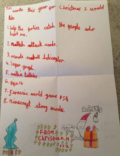 «Θέλω να βοηθήσεις την αστυνομία να συλληφθούν οι άνθρωποι που μου έκαναν κακό» έγραψε στο γράμμα του προς τον Άγιο Βασίλη ένα 7χρονο αγόρι από το Salford των ΗΠΑ το οποίο πυροβολήθηκε μαζί με τη μητέρα του στο κατώφλι του σπιτιού τους, όταν άνοιξαν την πόρτα σε δυο άντρες που χτύπησαν το κουδούνι τους. Αυτή ήταν πρώτη επιθυμία που εξέφρασε ο 7χρονος και αμέσως μετά ακολούθησε η λίστα με τα παιχνίδια που θέλει.