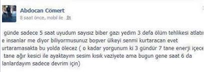 «Κοιμήθηκα μόλις 5 ώρες μέσα σε 3 ημέρες. Με ψέκασαν με δακρυγόνα αμέτρητες φορές, ρίσκαρα τον θάνατο μου 3 φορές. Και ξέρετε τι λέει ο κόσμος; Παράτα τα, εσύ θα είσαι που θα σώσεις τη χώρα; Ναι, και αν δεν την σώσουμε εμείς, θα πεθάνουμε όσο το προσπαθούμε. Είμαι τόσο κουρασμένος που έχω πιει 7 ενεργειακά ποτά και 9 παυσίπονα σε 3 μέρες, η φωνή μου έχει κλείσει αλλά θα είμαι ξανά στην πλατεία σήμερα στις 6. Απλά για την επανάσταση».
