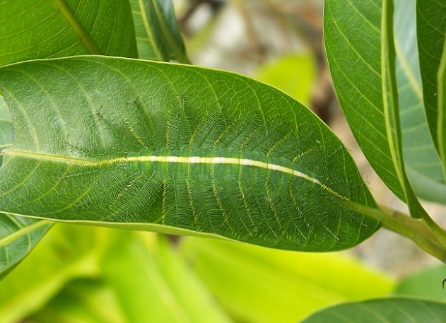 Με μια πρώτη ματιά βλέπουμε ένα όμορφο, γυαλιστερό, πράσινο φύλο ενεός φυτού. Με μια δεύτερη ματιά μπορεί να αντιληφθούμε πως κάτι υπάρχει επάνω στην επιφάνειά του, κι αυτό με δυσκολία! Η κάμπια “βαρώνος” είναι εξπέρ στο καμουφλάζ κάνοντας τους θηρευτές της να μην μπορούν να την αντιληφθούν με τίποτα.