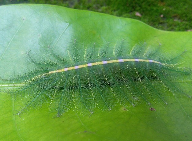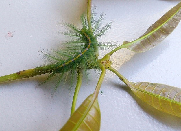 Η απίστευτη εικόνα δείχνει τις ικανότητες καμουφλάζ της κάμπιας “βαρώνος” (Euthalia aconthea) , που τις χρησιμοποιεί με εξαιρετική ευκολία για να αντιμετωπίσει τους θηρευτές της. Ζει στην Ινδία και τη Νοτιοανατολική Ασία και καμουφλάρεται άριστα πάνω σε πράσινα φύλλα διάφορων φυτών και δέντρων. Το είδος της συνήθως προτιμά τα φύλλα μάνγκο και θεωρείται παράσιτο, ενώ πέρα από το φύλλο μοιάζει με ένα σύνολο “πευκοβελόνων”, αφού τα πόδια της είναι σαν μικρά τριχίδια, το ένα δίπλα στο άλλο.