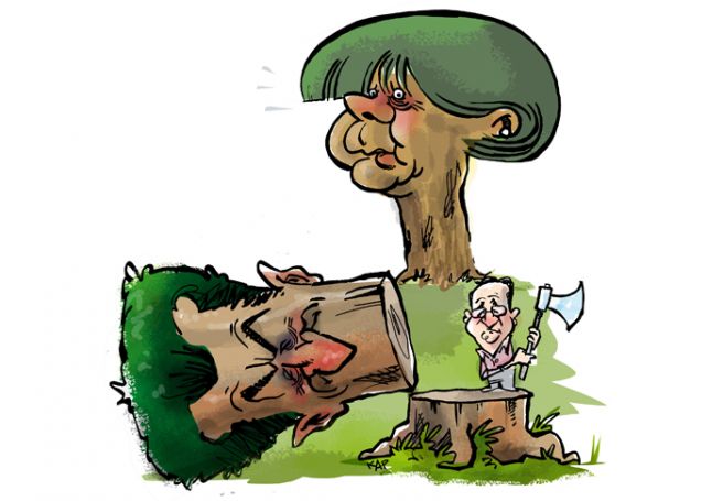 Στο δεύτερο, βλέπουμε τον Φρανσουά Ολάντ να κόβει το “δέντρο” Νικολά Σαρκοζί διπλά στο “δέντρο” Άνγκελα Μέρκελ.
