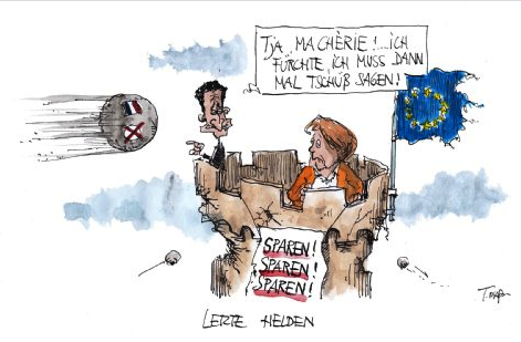 Ενώ στην τρίτη, “Τι να κάνουμε γλυκιά μου! Φοβάμαι πως πρέπει να σε αποχαιρετήσω”, λέει ο Σαρκοζί στην αγαπημένη του Μέρκελ, με την λέξη “εξοικονόμηση” να αναγράφεται τρεις φορές κάτω από τη Μέρκελ…
