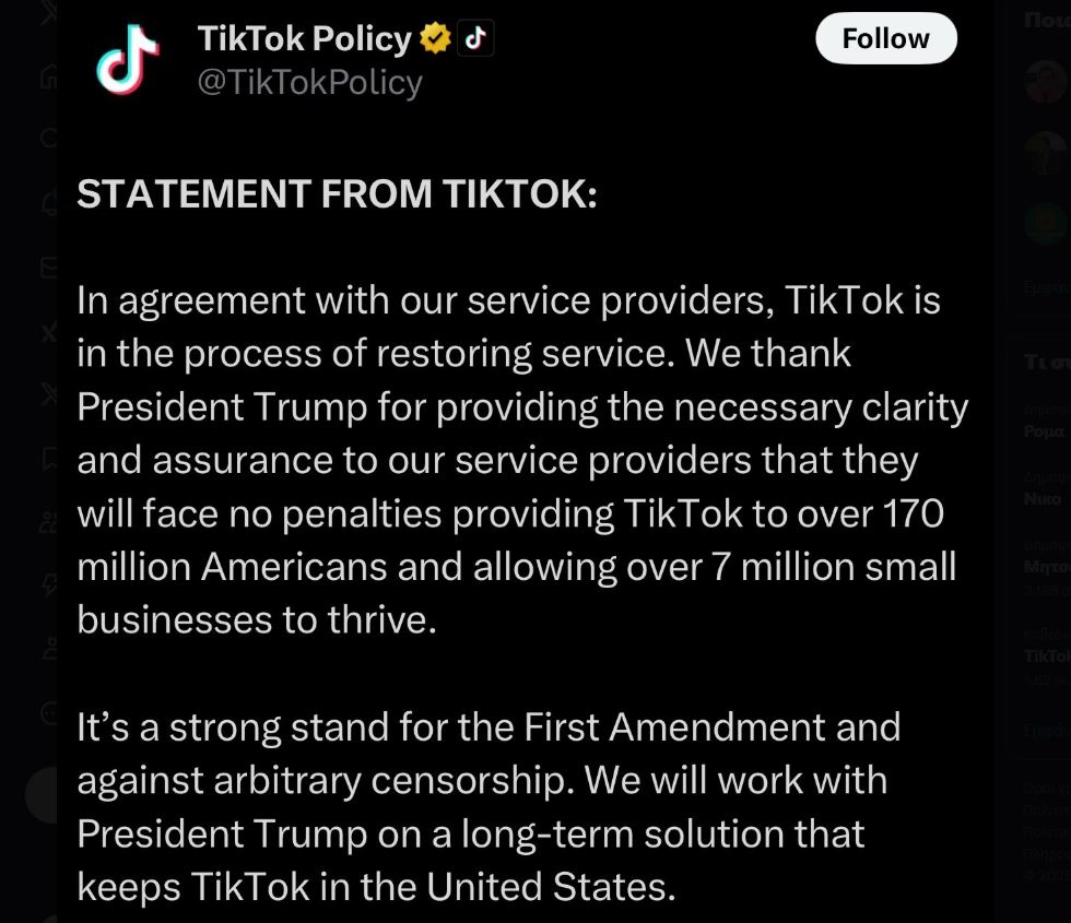 «Θα συνεργαστούμε με τον πρόεδρο Τραμπ για μια μακροπρόθεσμη λύση για να διατηρήσουμε το TikTok στις Ηνωμένες Πολιτείες», εξήγησε η εταιρεία.