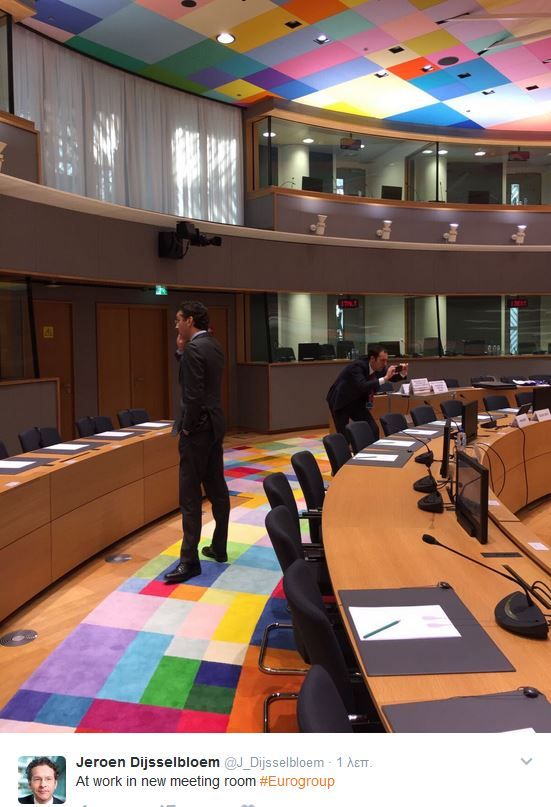 Όπως βλέπουμε στη φωτογραφία που ανέβασε ο Πρόεδρος του Eurogroup στο Twitter, ο ίδιος γράφει: «Κατά την εργασία στη νέα αίθουσα συνεδριάσεων».