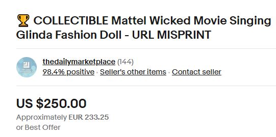 Η κούκλα Glinda πωλείται στα Αμερικανικά καταστήματα, με τιμή από 24,99 έως περίπου 40 δολάρια. Ωστόσο, στο eBay, η τιμή για τις συσκευασίες με τον λανθασμένο σύνδεσμο κυμαίνεται μεταξύ 175 και 500 δολαριών, καθώς συλλέκτες δείχνουν ιδιαίτερο ενδιαφέρον.