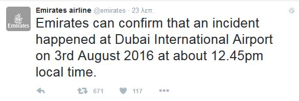 Στο μήνυμα η εταιρεία αναφέρει: «Επιβεβαιώνουμε το περιστατικό που σημειώθηκε στο αεροδρόμιο του Ντουμπάι, την 3η Αυγούστου 2016, περίπου στις 12 45 μμ (τοπική ώρα)».