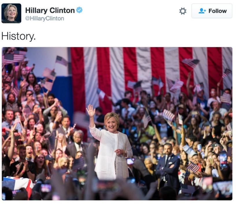 Η άλλοτε υπουργός Εξωτερικών των Αμερικανών, η οποία κέρδισε το χρίσμα στο συνέδριο των Δημοκρατικών, αρκέστηκε σε μία λέξη στην ανάρτησή της. «Ιστορία», έγραψε μαζί με μία φωτογραφία της στο πόντιουμ του συνεδρίου.