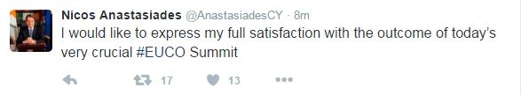 «Θα ήθελα να εκφράσω την πλήρη ικανοποίηση μου για την έκβαση της κρίσιμης Συνόδου Κορυφής» έγραψε στο Twitter ο κ. Αναστασιάδης.