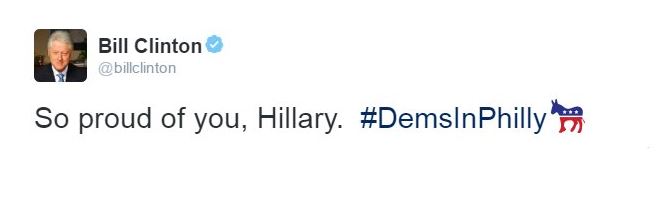 Μετά το tweet της μεγάλης νικήτριας του συνεδρίου των Δημοκρατικών, Χίλαρι Κλίντον για το χρίσμα της διεκδίκησης του προεδρικού θώκου στις ΗΠΑ πήρε τη σκυτάλη ο σύζυγος.