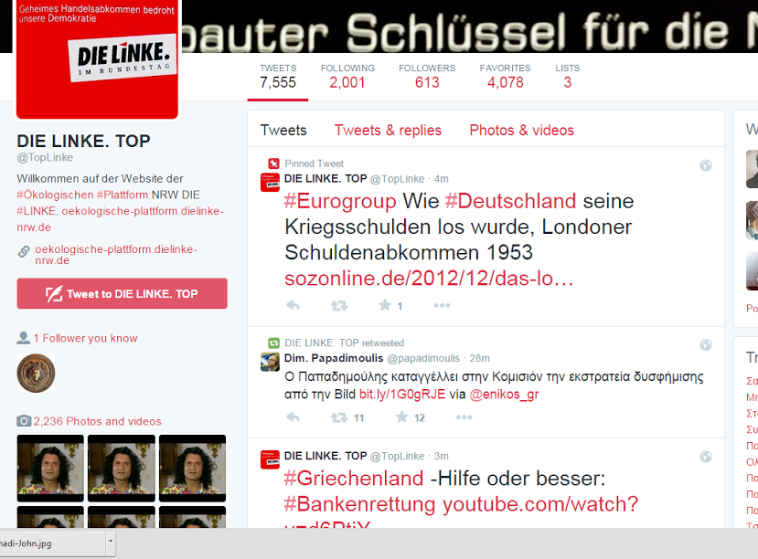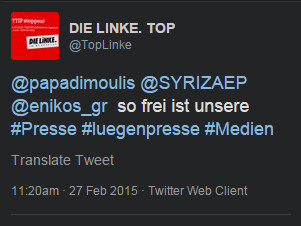 Σε σχόλιο με αφορμή την ερώτηση του ευρωβουλευτή του ΣΥΡΙΖΑ και Αντιπροέδρου του Ευρωκοινοβουλίου, Δημήτρη Παπαδημούλη, καθώς και το δημοσίευμα του enikos.gr για το πρωτοσέλιδο της Bild με το «Όχι» στη βοήθεια προς την Ελλάδα, προέβη το κόμμα της Γερμανικής Αριστεράς (Die Linke) στο twitter.