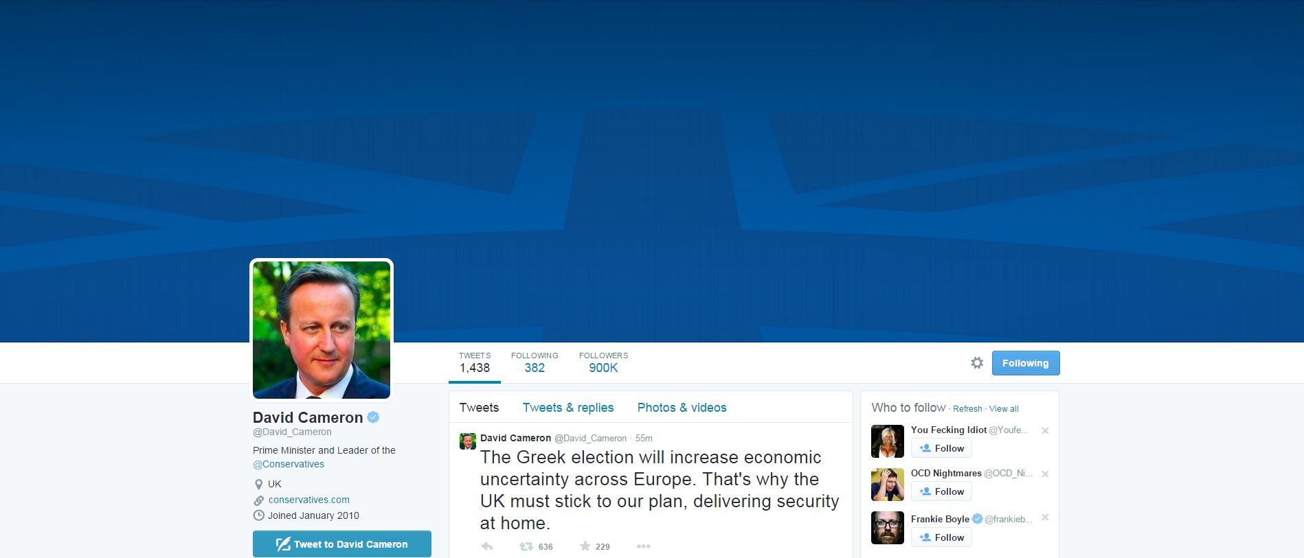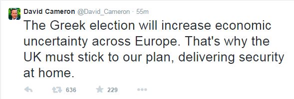 «Οι εκλογές στην Ελλάδα θα αυξήσουν την οικονομική αβεβαιότητα σε όλη την Ευρώπη. Αυτός είναι ο λόγος που το Ηνωμένο Βασίλειο πρέπει να παραμείνει προσηλωμένο στο δικό μας σχέδιο, το οποίο εγγυάται την -οικονομική- ασφάλεια στο εσωτερικό» της χώρας, έγραψε ο Ντέιβιντ Κάμερον στον λογαριασμό του στον ιστότοπο κοινωνικής δικτύωσης Twitter.