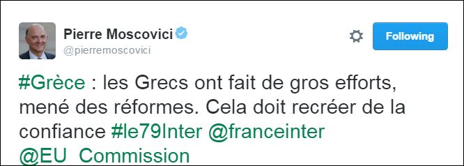 Ο ευρωπαίος επίτροπος Οικονομικών Υποθέσεων Πιερ Μοσκοβισί έκανε αναφορά στην Ελλάδα, γράφοντας στον προσωπικό του λογαριασμό στο twitter, πριν από λίγη ώρα ότι: «Οι Έλληνες έχουν κάνει μεγάλες προσπάθειες, καθοδηγούμενες από τις μεταρρυθμίσεις. Αυτό πρέπει να ξαναδημιουργήσει εμπιστοσύνη».