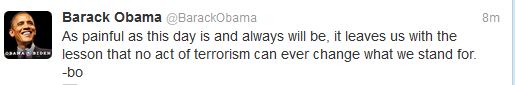 Ημέρα μνήμης για τους Αμερικανούς η σημερινή, 11 χρόνια μετά το συνταρακτικό τρομοκρατικό χτύπημα της 11ης Σεπτεμβρίου.Ημέρα που την αποκαλούν «ημέρα που άλλαξε τον κόσμο». Ο Μπάρακ Ομπάμα λίγα λεπτά νωρίτερα, έστειλε το δικό του μήνυμα για τη σημερινή ημέρα μέσα από τον προσωπικό του λογαριασμό στο Twitter.«Όσο οδυνηρή και αν είναι η σημερινή ημέρα, και πάντα θα είναι, μας διδάσκει ότι καμία πράξη τρομοκρατίας δεν μπορεί να αλλάξει αυτά τα οποία πρεσβεύουμε».