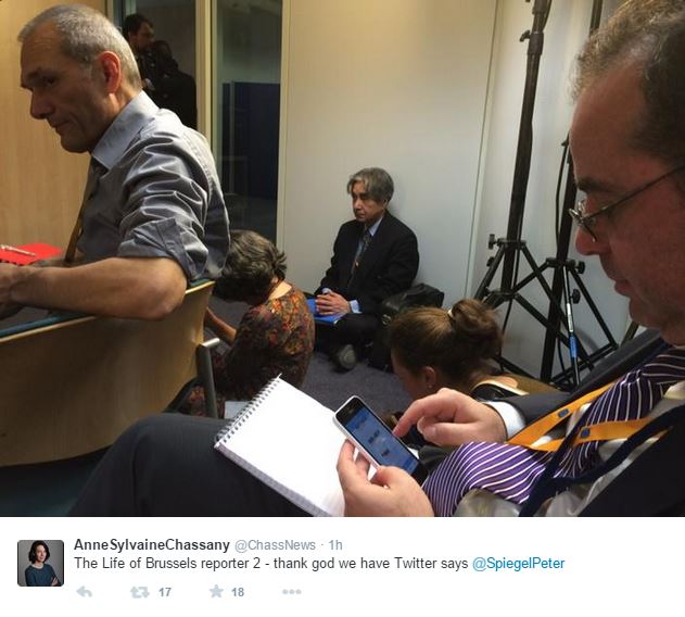 Ο ρεπόρτερ των Financial Times στις Βρυξέλλες, Peter Spiegel, κατά τη διάρκεια της αναμονής για τη Συνέντευξη Τύπου μετά το τέλος του Eurogroup, θέλοντας να “χαλαρώσει”, έκανε retweet μία φωτογραφία, με τους, μάλλον καταβεβλημένους, συναδέλφους του, δημοσιογράφους, της οποίας το αστειευόμενο σχόλιο ήταν λόγια του: «Η ζωή των ρεπόρτερ στις Βρυξέλλες. Δόξα τω Θεώ έχουμε το Twitter, λέει ο Peter Spiegel».