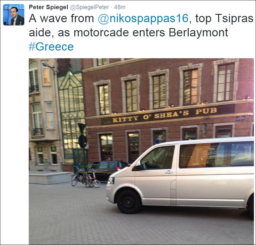 Τον χαιρετισμό του υπουργού Επικρατείας Νίκου Παππά μέσα από το βανάκι τη στιγμή που έφτανε στο κτίριο της Κομισιόν “έπιασε” με τον φωτογραφικό του φακό ο δημοσιογράφος των Financial Times, Peter Spiegel.