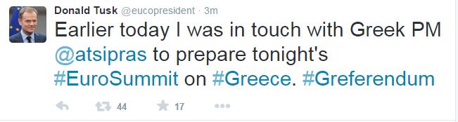 “Νωρίτερα σήμερα, ήμουν σε επαφή με τον Έλληνα Πρωθυπουργό, Αλέξη Τσίπρα για να προετοιμάσουμε την αποψινή Σύνοδο Κορυφής για την Ελλάδα”, έγραψε πριν από λίγα λεπτά στον προσωπικό του λογαρισμό στο twitter, ο πρόεδρος του Ευρωπαϊκού Συμβουλίου, Ντόναλντ Τουσκ.