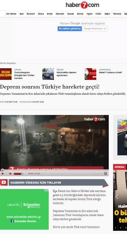 Έντονα αισθητός έγινε και στην Τουρκία ο ισχυρός σεισμός που σημειώθηκε στην Κω και στοίχισε τη ζωή σε δύο τουρίστες. Εκτενείς είναι οι αναφορές στα τουρκικά μέσα ενημέρωσης, ενώ η ιστοσελίδα haber7.com δημοσιεύει βίντεο που έστειλε αναγνώστης του enikos.gr το οποίο δείχνει τις ζημιές που προκλήθηκαν στην Κω από τον σεισμό.