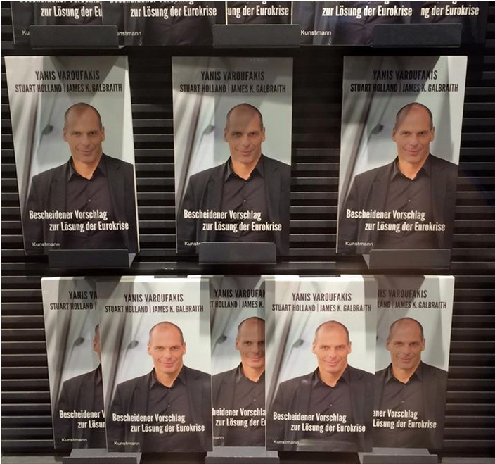 Στα ράφια κεντρικού βιβλιοπωλείου του Βερολίνου διατίθεται το βιβλίο του Γιάνη Βαρουφάκη με τίτλο «Μια μετριοπαθής πρόταση για την επίλυση της κρίσης του ευρώ». Το βιβλίο του Έλληνα υπουργού Οικονομικών έχει τοποθετηθεί στη βιτρίνα του καταστήματος και είναι μεταφρασμένο στα γερμανικά ενώ στο εξώφυλλο υπάρχει η φωτογραφία του κ. Βαρουφάκη.