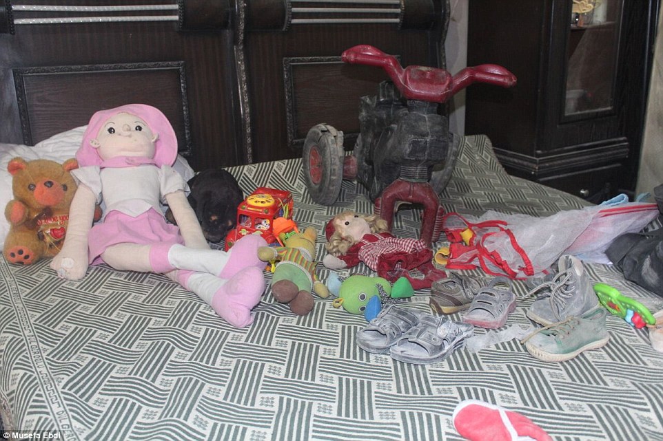 Σκονισμένα παιδικά παπούτσια, ρούχα και παιχνίδια διακρίνονται ανάμεσα στα ερείπια του σπιτιού.