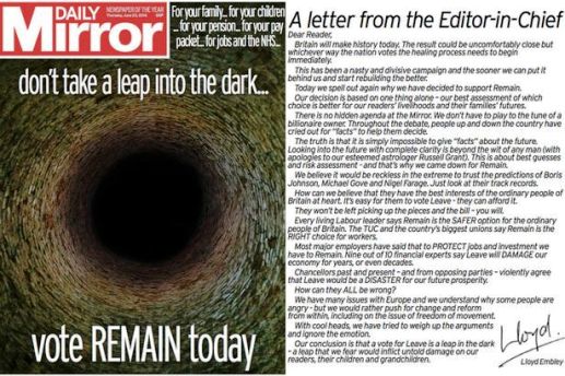 Η Daily Mirror κυκλοφορεί με τίτλο: “Μην κάνετε άλμα στο σκοτάδι. Ψηφίστε παραμονή” με μια χαρακτηριστική φωτογραφία στο πρωτοσέλιδο.