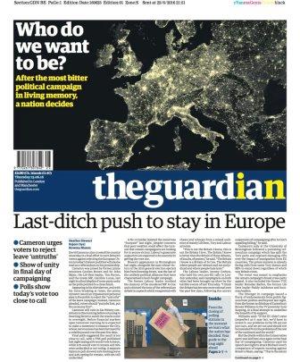Με εικόνες από το διάστημα κυκλοφόρησαν οι βρετανικές εφημερίδες Sun και Guardian. Ο Guardian στο πρωτοσέλιδό του έχει μια δορυφορική εικόνα της Ευρώπης τη νύχτα, με φωτισμένες τις πόλεις.
