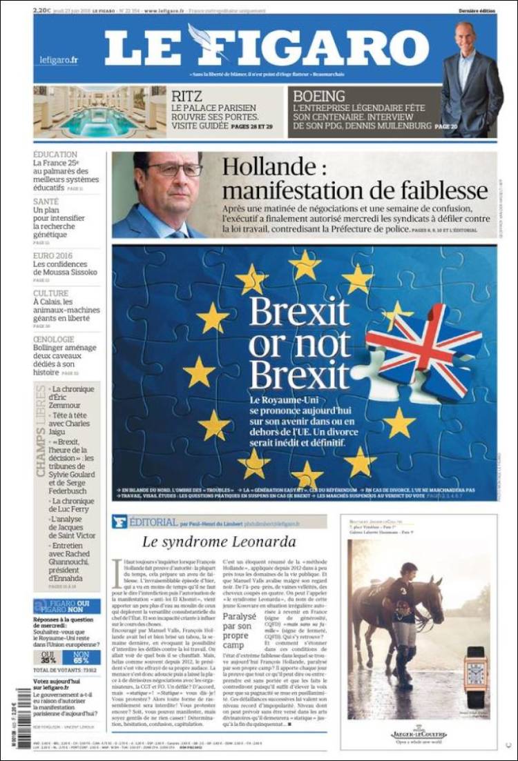 Η γαλλική Le Figaro παραφράζει τη φράση του Σαίξπηρ “Να ζει κανείς ή να μη ζει” και ρωτά “Brexit ή να μην… Brexit;”.