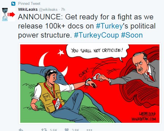 “Ετοιμαστείτε για μια μάχη καθώς θα δώσουμε στη δημοσιότητα 100.000 + έγγραφα για τη δομή πολιτικής εξουσίας της Τουρκίας”, αναφέρει στο Twitter ο ιστότοπος WikiLeaks.