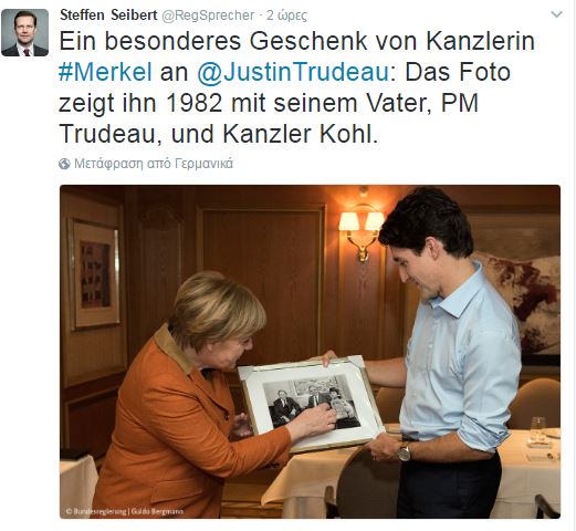 Ένα ιδιαίτερο δώρο έκανε η Γερμανίδα Καγκελάριος Άνγκελα Μέρκελ στον Πρωθυπουργό του Καναδά, Τζάστιν Τριντό κατά την επίσκεψή του στο Βερολίνο.Όπως αποκάλυψε, ο εκπρόσωπος της γερμανικής κυβέρνησης, Στέφεν Ζάιμπερτ μέσω Twitter, η Γερμανίδα Καγκελάριος χάρισε στον Πρωθυπουργό του Καναδά μία φωτογραφία του 1982 στην οποία απεικονίζεται ο πατέρας του Τριντό, ο οποίος ήταν τότε Πρωθυπουργός του Καναδά με τον τότε καγκελάριο της Γερμανίας, Χέλμουτ Κολ.